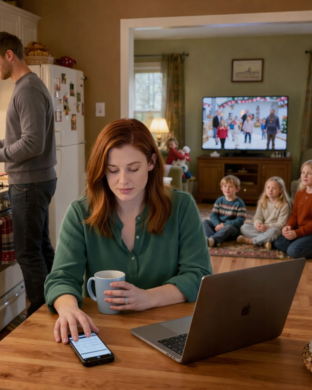 Inside, the house smelled like Mom’s pot roast, the one she always started at noon, the one that made the whole first floor feel like a warm hand on your back. Coats were already on the hooks by the door: Ashley’s red puffer, her daughter Mackenzie’s pink jacket, her son Jordan’s dinosaur hoodie, Mom’s gray cardigan. Five coats. Five hooks. I hung ours on the banister because there was no room. The guest-room door was closed. Mackenzie and Jordan were already inside, giggling, settled. Their shoes were lined up by the bed. Their suitcases were unzipped. Jordan’s iPad was charging on the nightstand. They’d been there since Tuesday.